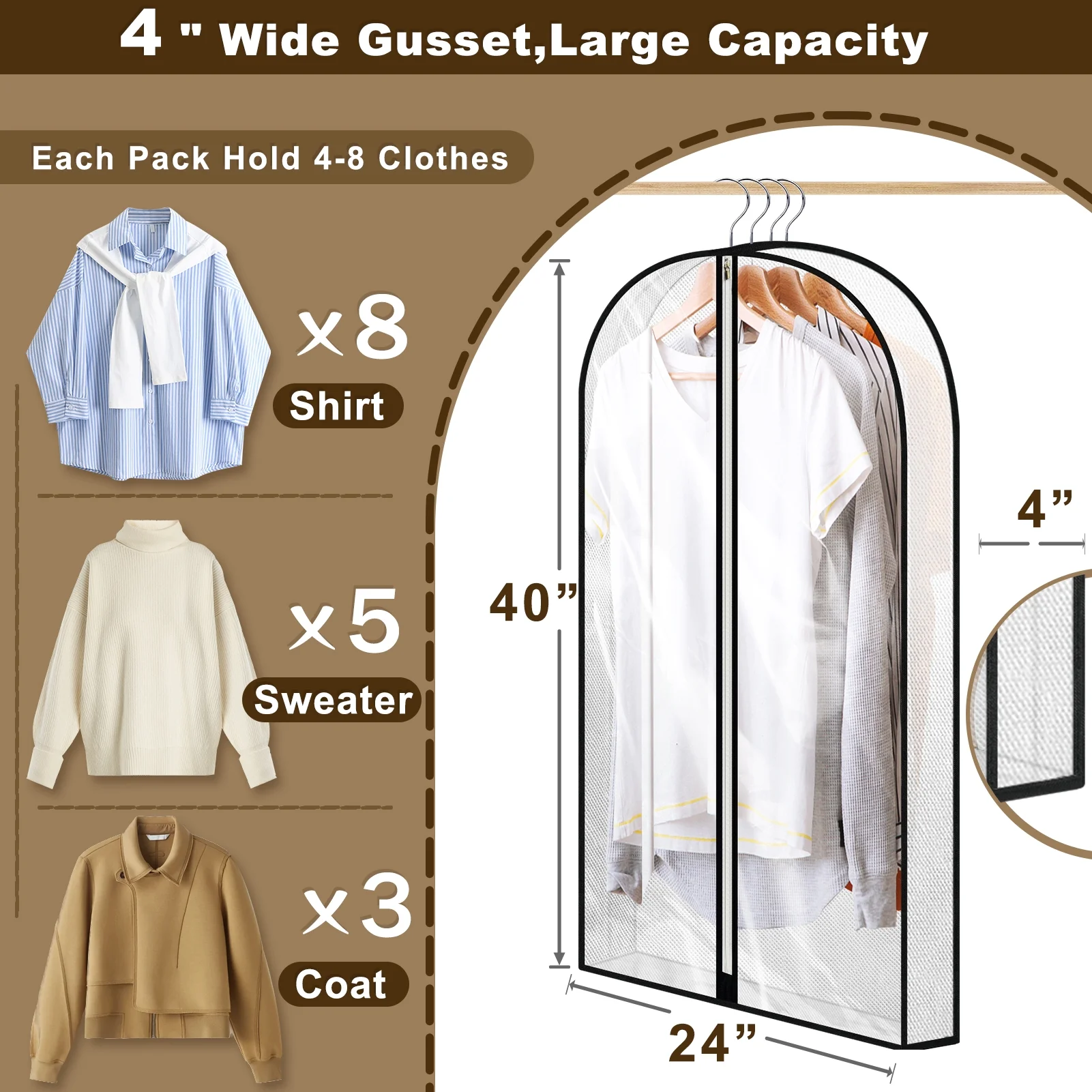- Maximize Space: Garment bag measures 40″ x 24″ with a 4″ gusset, accommodating suits, shirts, dresses, sweaters, and coats, optimizing closet storage.