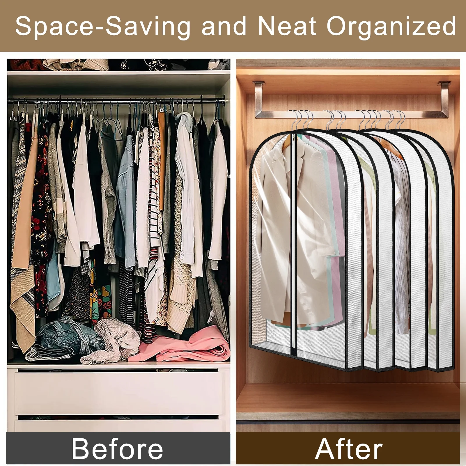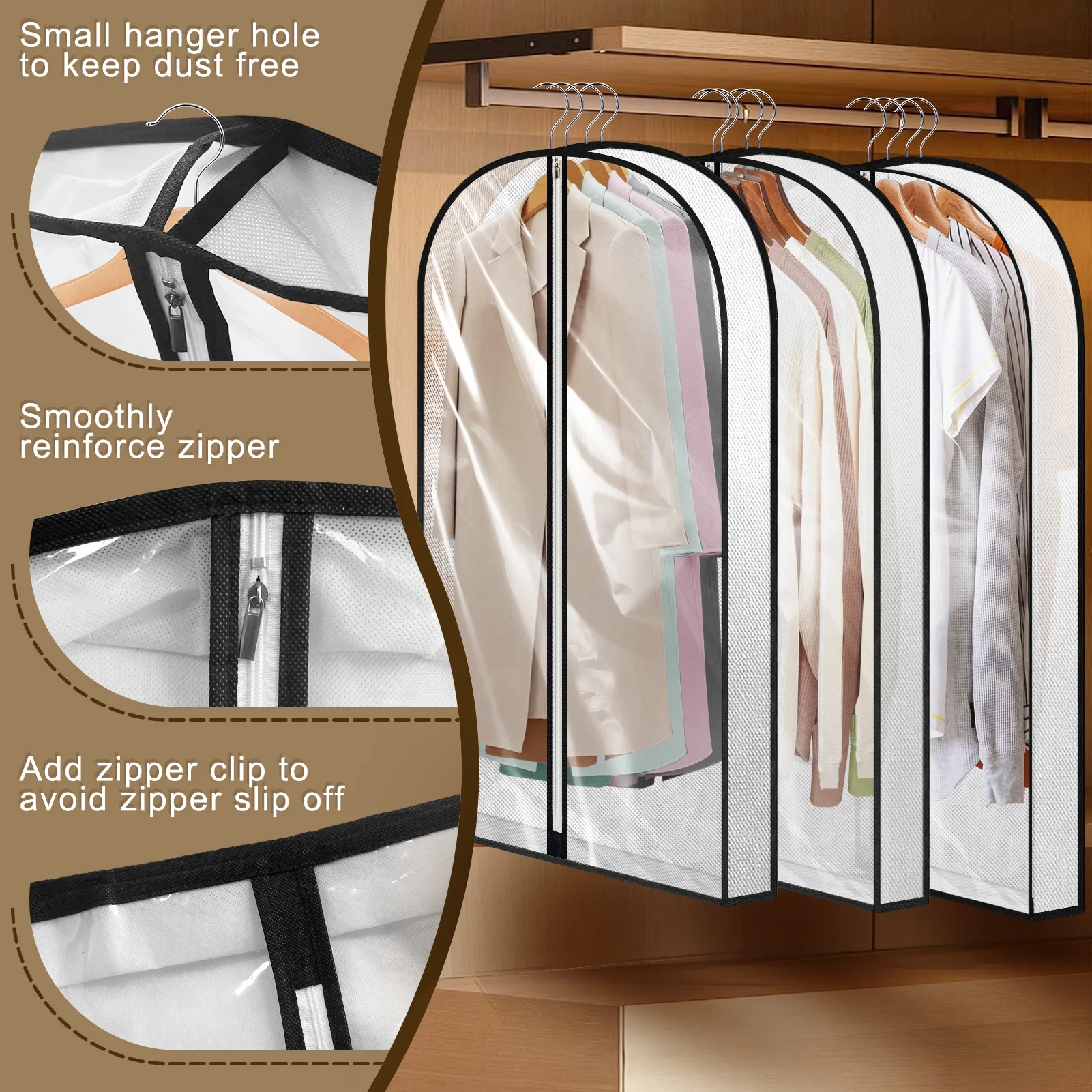 - Secure Hanging: Small top holes allow hanger hooks to pass through, fitting snugly over hangers for better dust protection and maintaining clothes’ integrity.