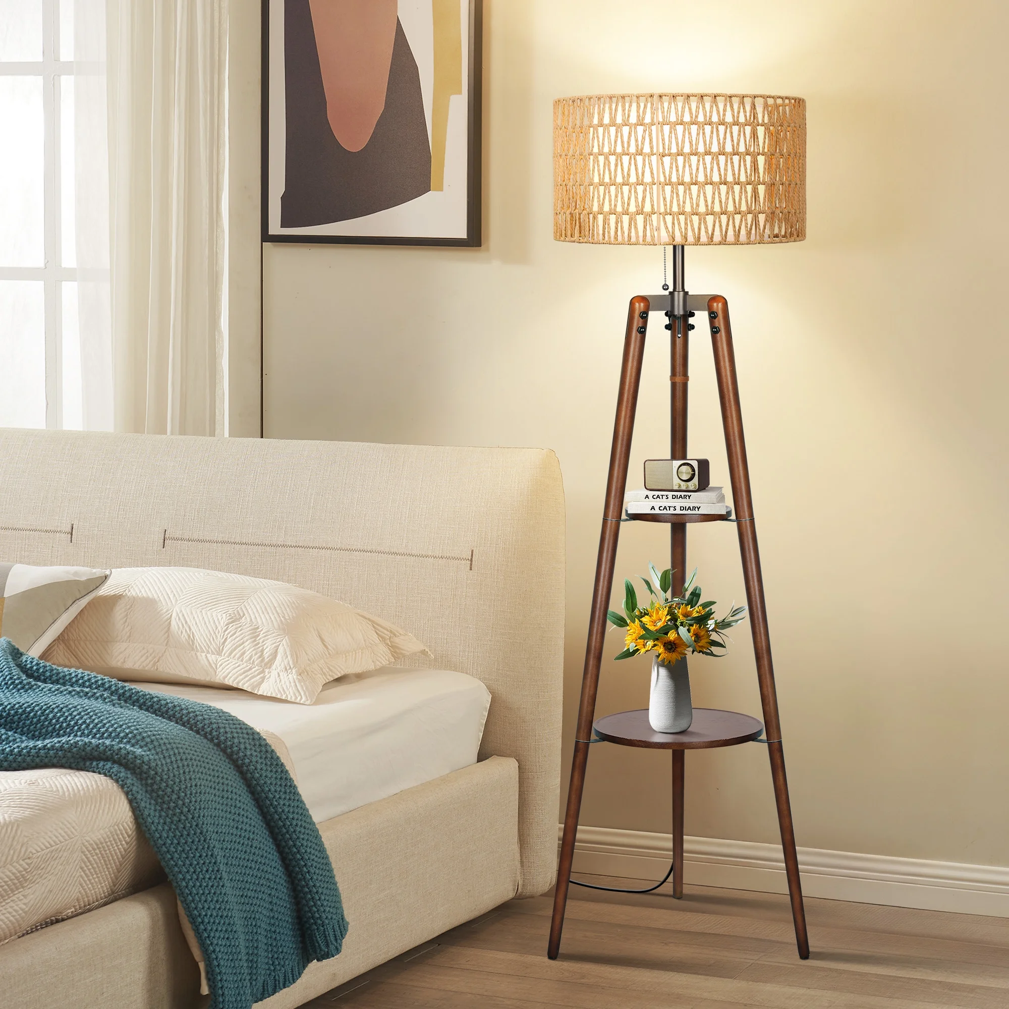 OUTON Boho Rattan Tripod Floor Lamp with Shelves, Dimmable Standing Lamp with Remote Control,Wood Tall Floor Lamps for Living Room Bedroom Office Farmhouse (Bulb Included)